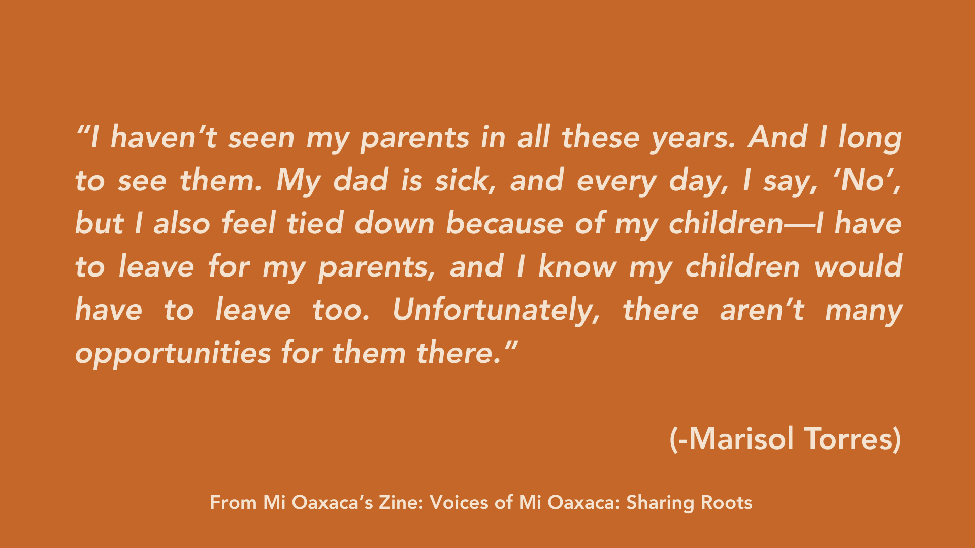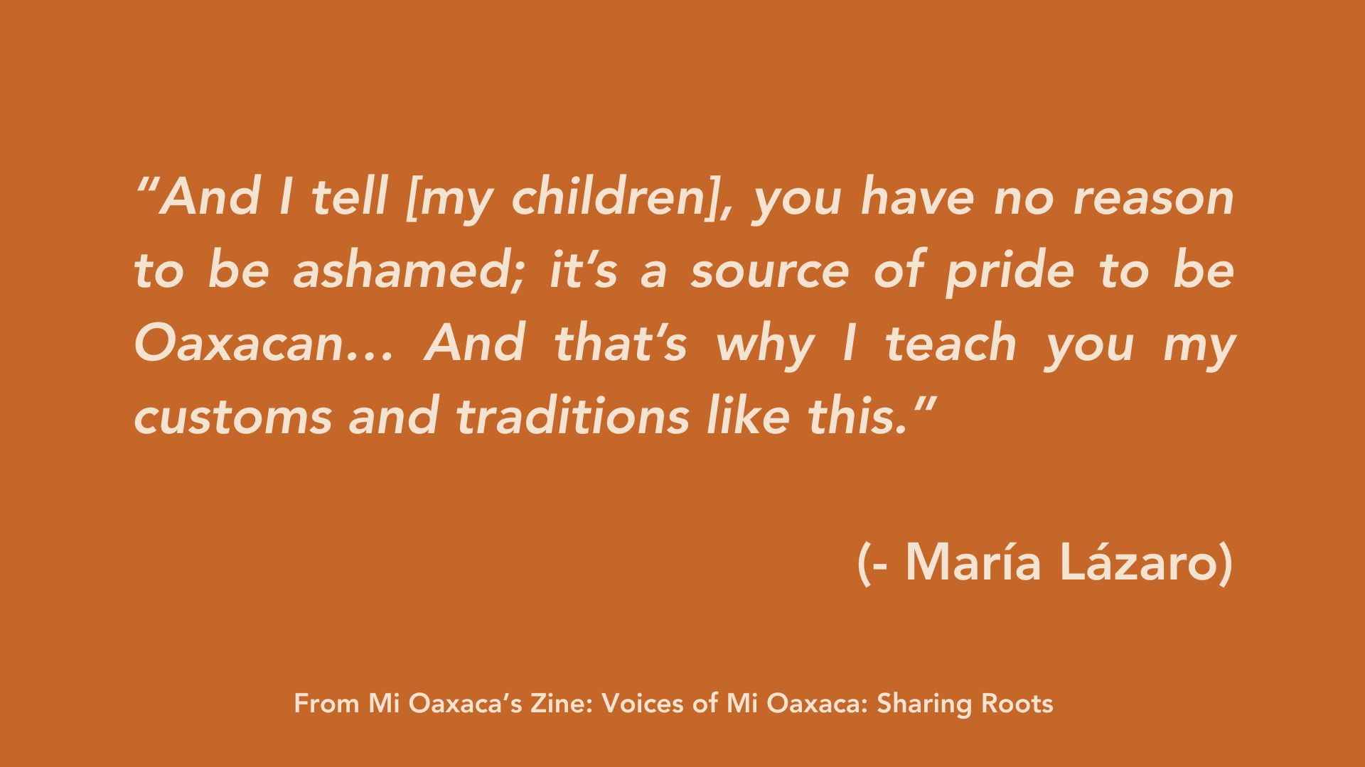 Voices of Mi Oaxaca: Sharing Roots centers the stories of participants as they are. As you read about their experiences, you will find guiding questions that we hope prompt you to think more deeply about the way the stories, ideas and values expressed through these personal narratives relate to your own ideas, beliefs and experiences.